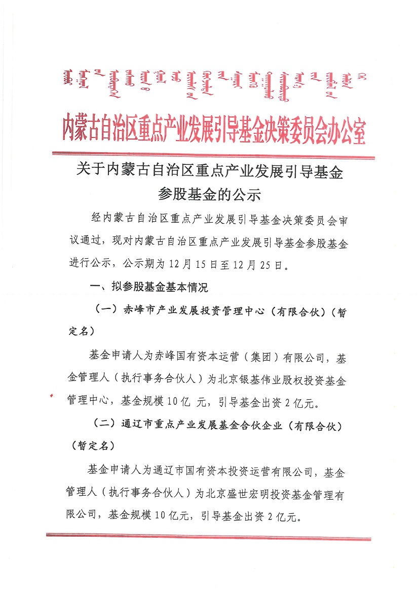 關(guān)于內(nèi)蒙古自治區(qū)重點(diǎn)產(chǎn)業(yè)發(fā)展引導(dǎo)基金參股基金的公示