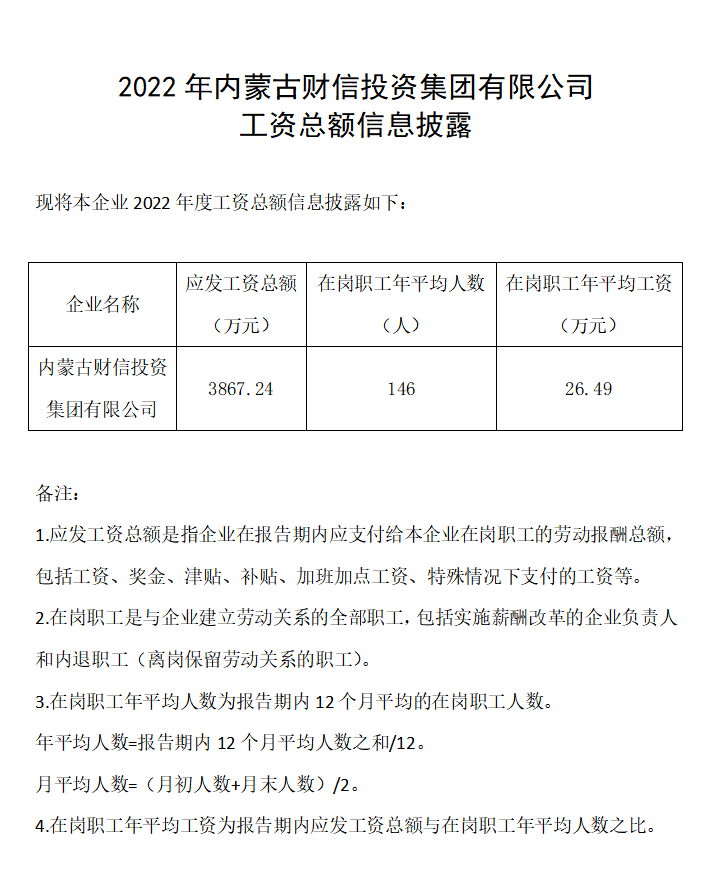 2022年內(nèi)蒙古財信投資集團有限公司工資總額信息披露